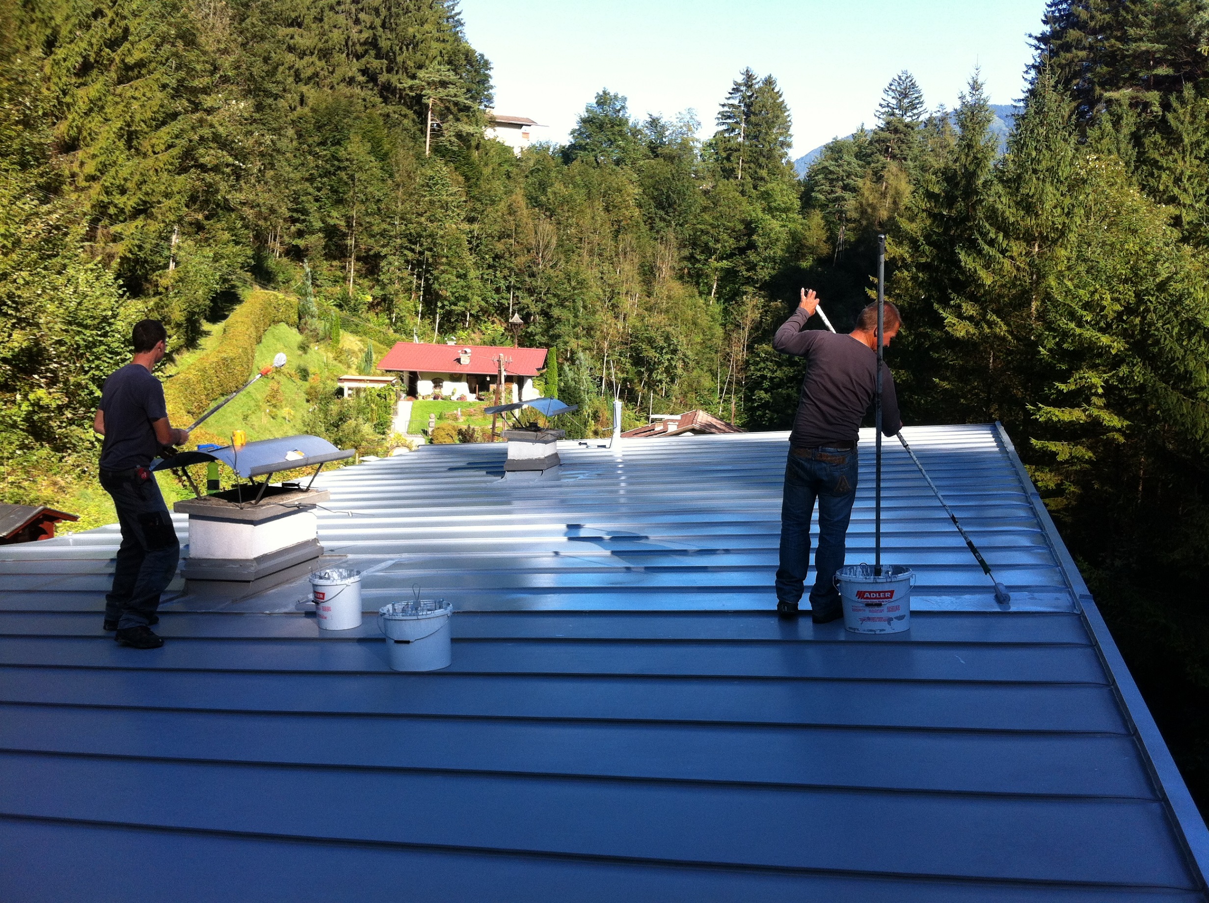 Falls Ihr Dach schon älter ist und der Lack abzusplittern oder auszubleichen beginnt, streichen wir Ihnen gerne zwei Lagen Speziallack darauf. Ihr Dach sieht danach aus wie neu und hält wieder für viele Jahre. Der von uns verwendete Lack wird auch in Skiregionen für Liftstützen und dergleichen verwendet und ist ein Spitzenprodukt, das sich durch außerordentliche Witterungsbeständigkeit auszeichnet.